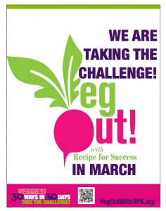 Sign up online at vegoutwithrfs.org or get the free phone app from Recipe For Success. There is also a paper worksheet, if you prefer. Form a team with your class, scout troop, family members or just sign up on your own.