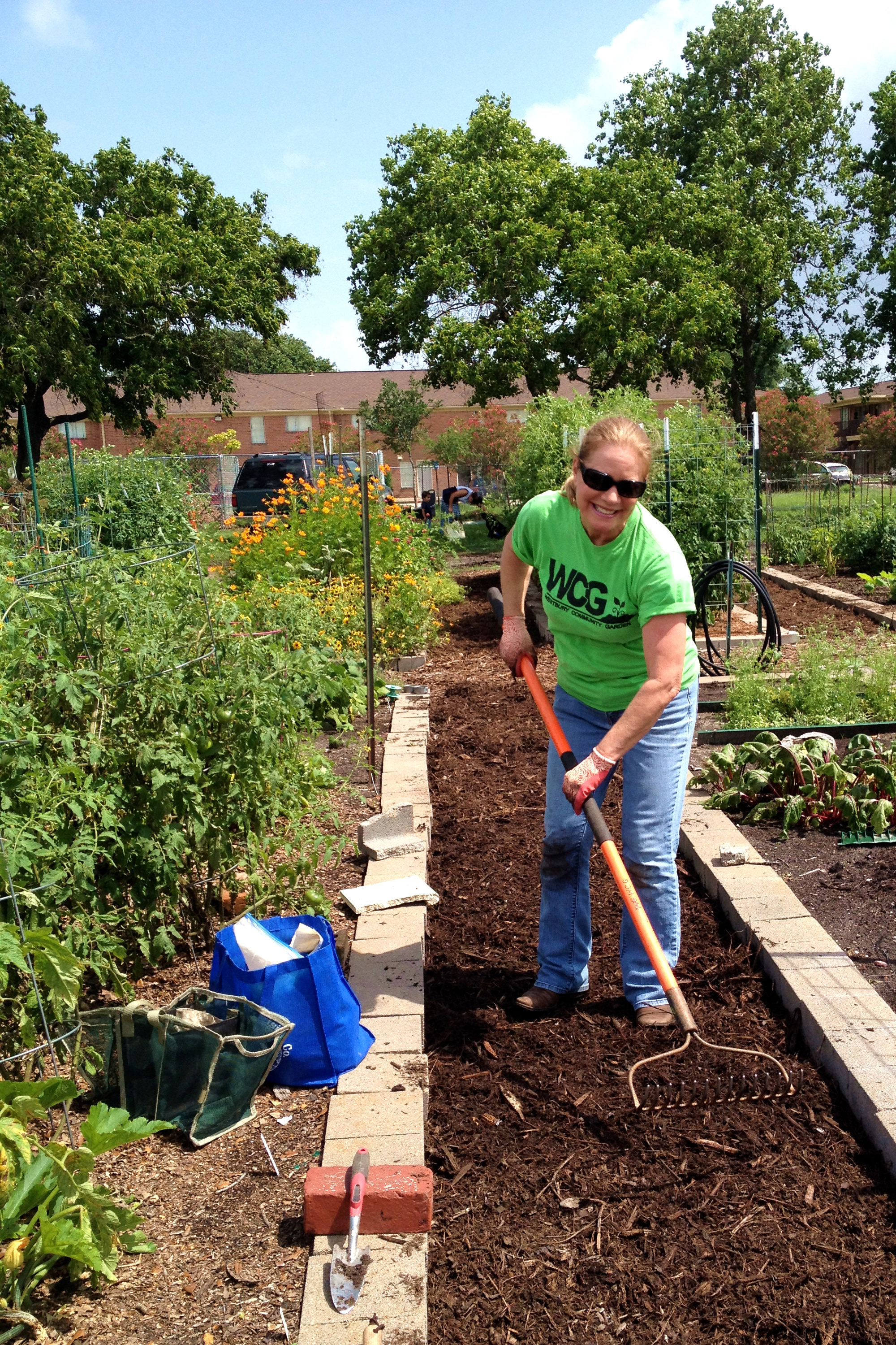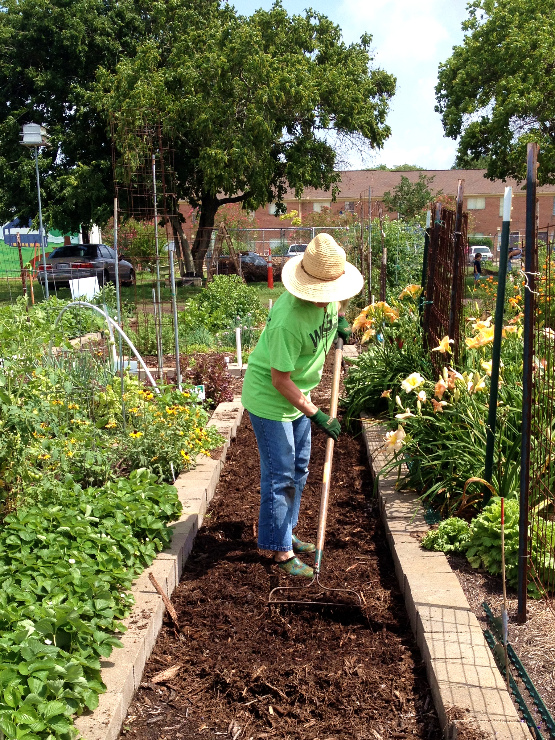 Cindy rakes the mulch smooth in the weed-free aisles.