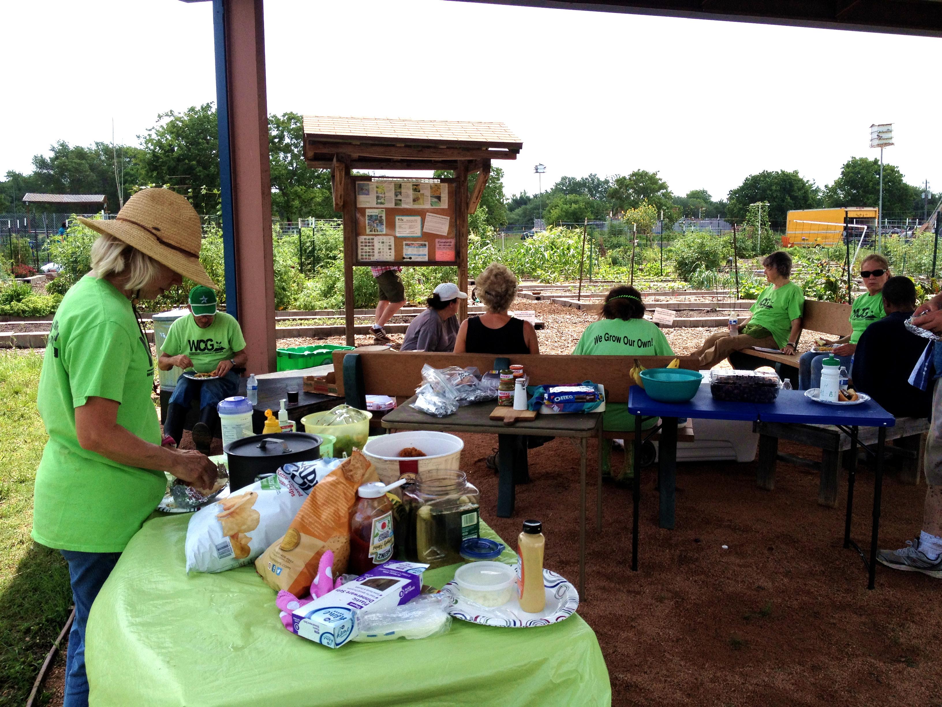 More than 20 volunteers came out on Saturday morning and moved almost the whole 18 yard mountain of mulch into the weed-free aisles. Gardeners came and went for 6 hours and the progress was steady. Half way through, we took a lunch break with fried chicken, hot dogs, chips, salads, fruit and baked goods.